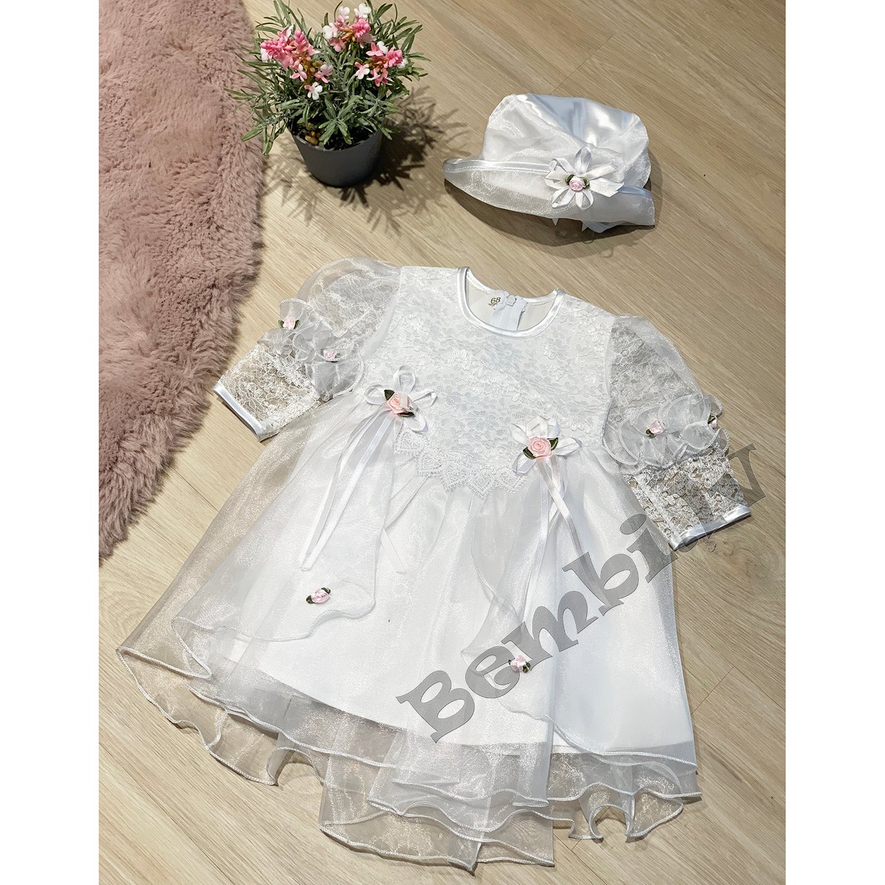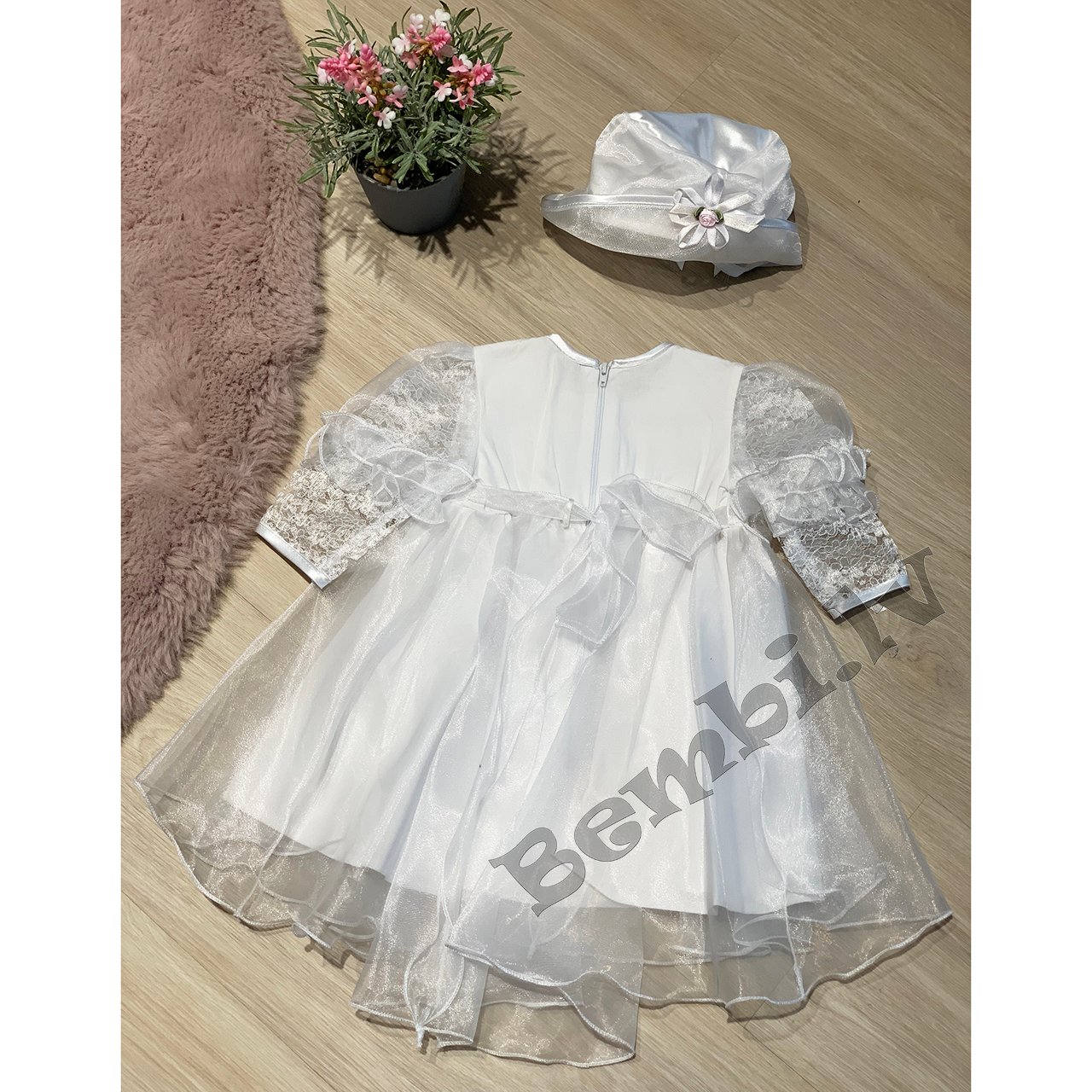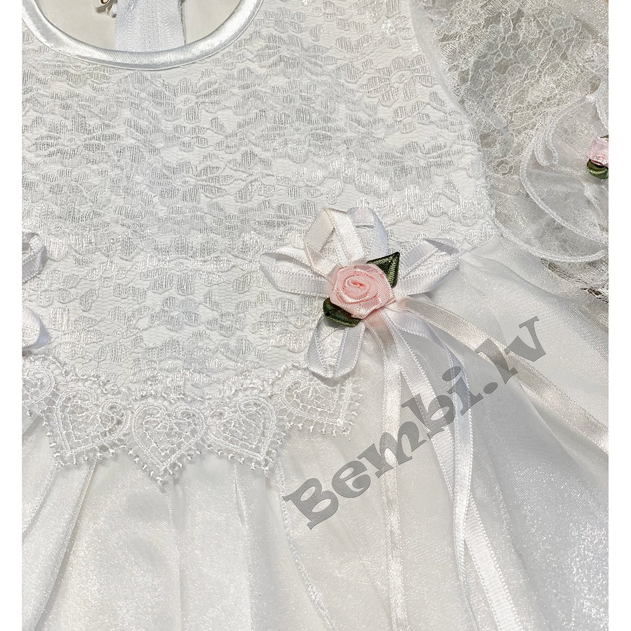Balta svētku kleita ar mežģīņu slāni priekšpusē, tilla volāniem.