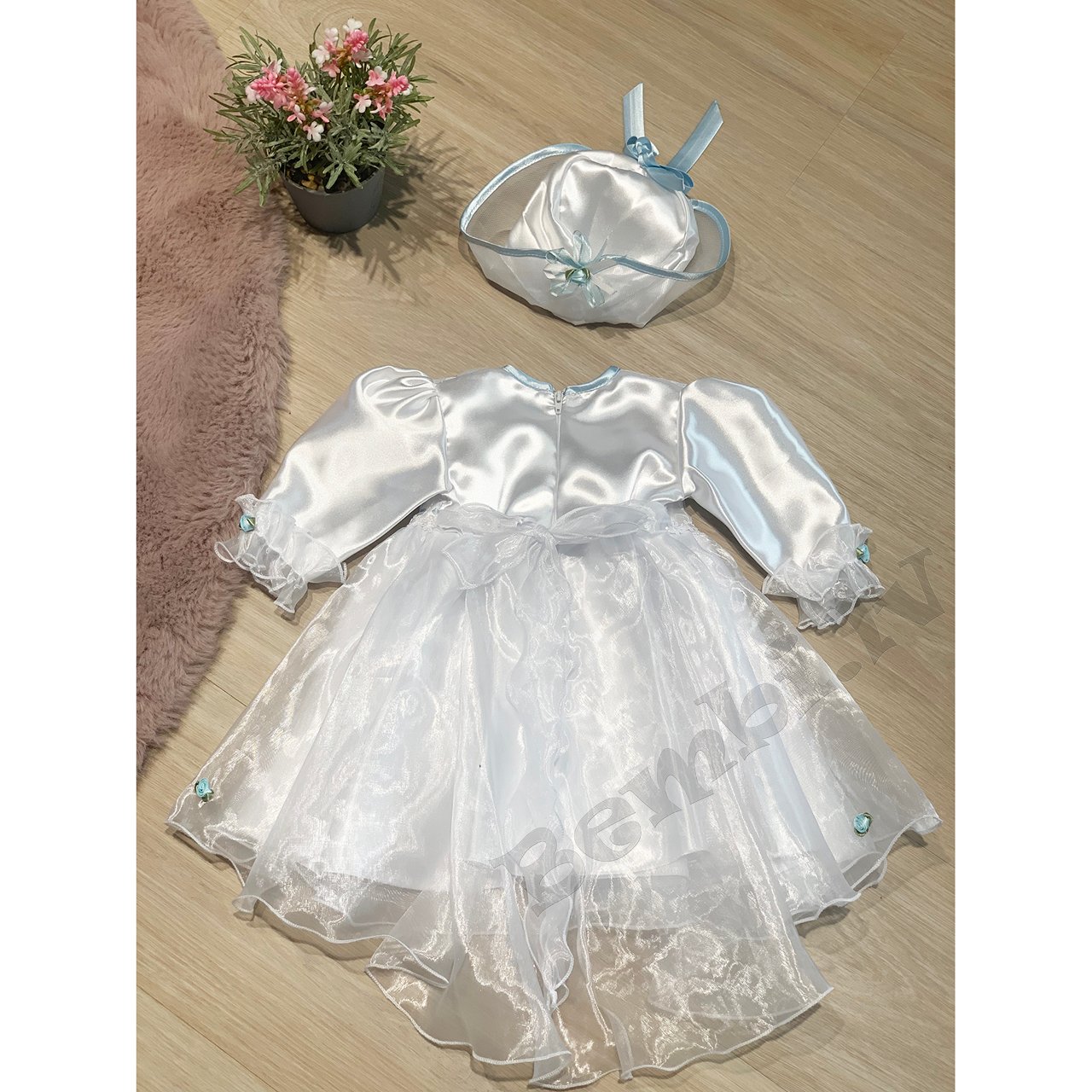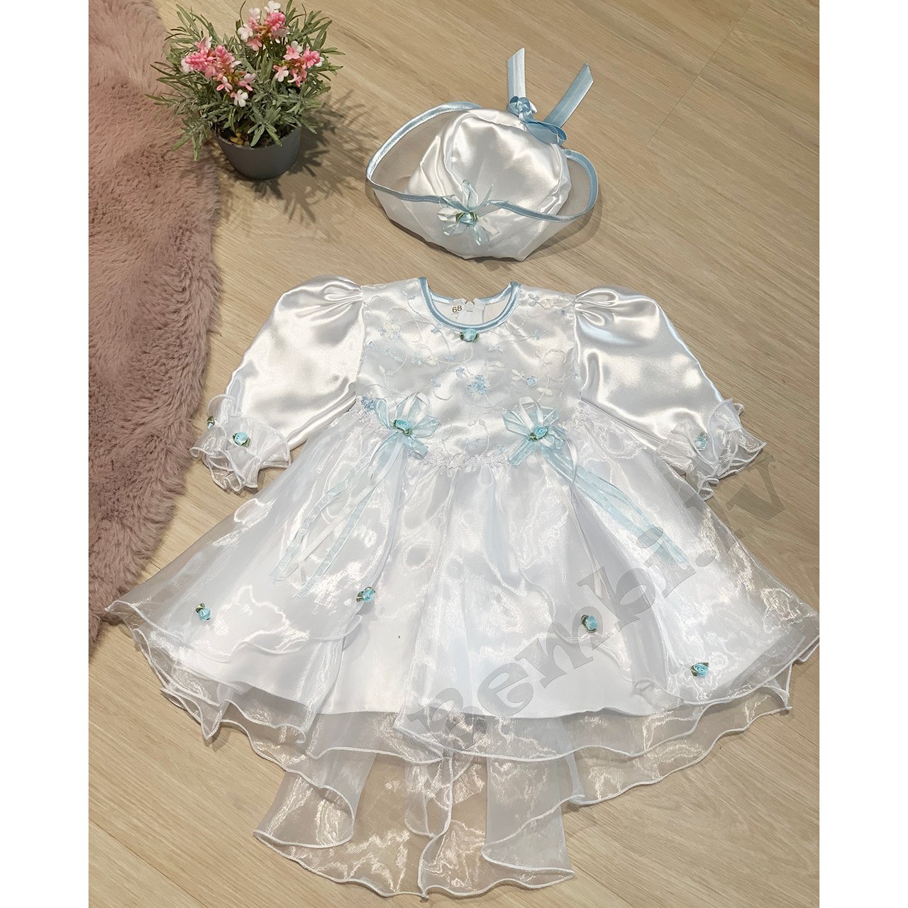 Balta ar zilu akcentu svētku kleita ar cepuri 68 izm.
