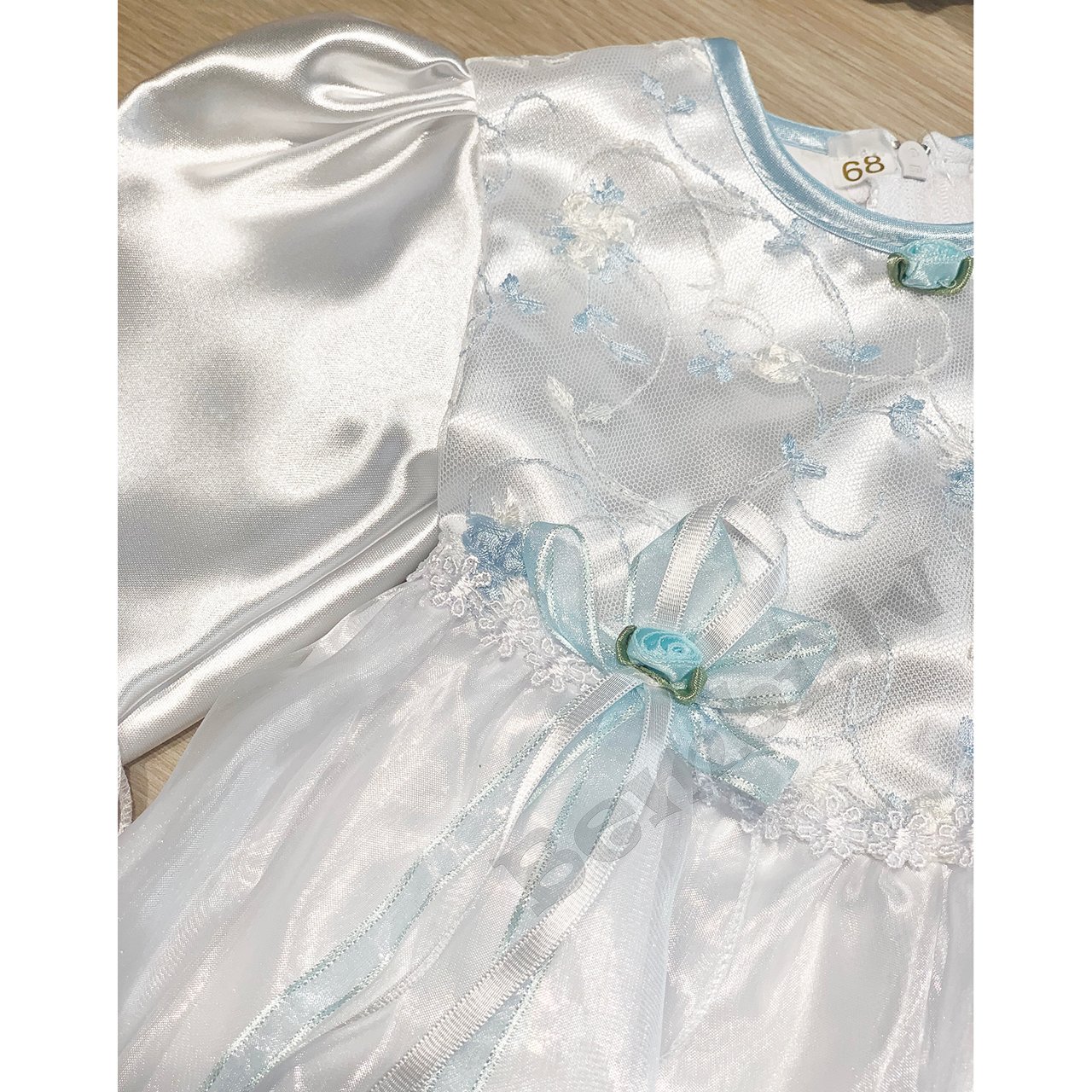 Baltā krāsā svētku kleita ar izšūtām gaiši zilām puķēm, tillā volāniem.