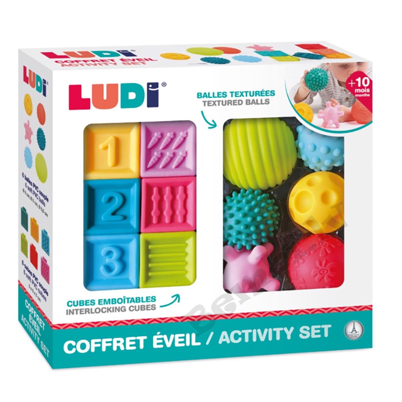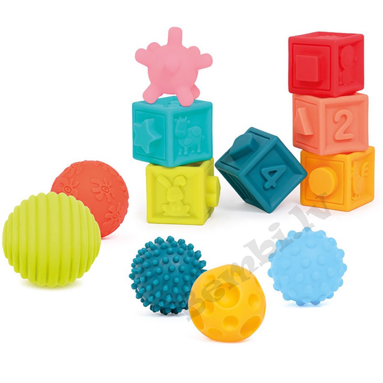 Komplektā ietilpst 6 dažādu tekstūru bumbiņas (Ø 8, 6 un 5,5 cm) un 6 kubi (5 × 6 × 5 cm) ar cipariem, reljefiem, dzīvniekiem un savstarpēji savienojamām malām, kas ļauj veidot konstrukcijas.