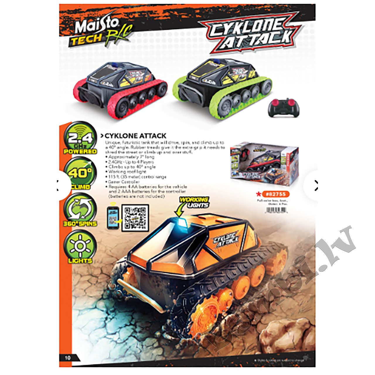 - Kontrolierim nepieciešamas 2 x AAA baterijas un transportlīdzeklim 4 x AA baterijas (nav iekļauta).