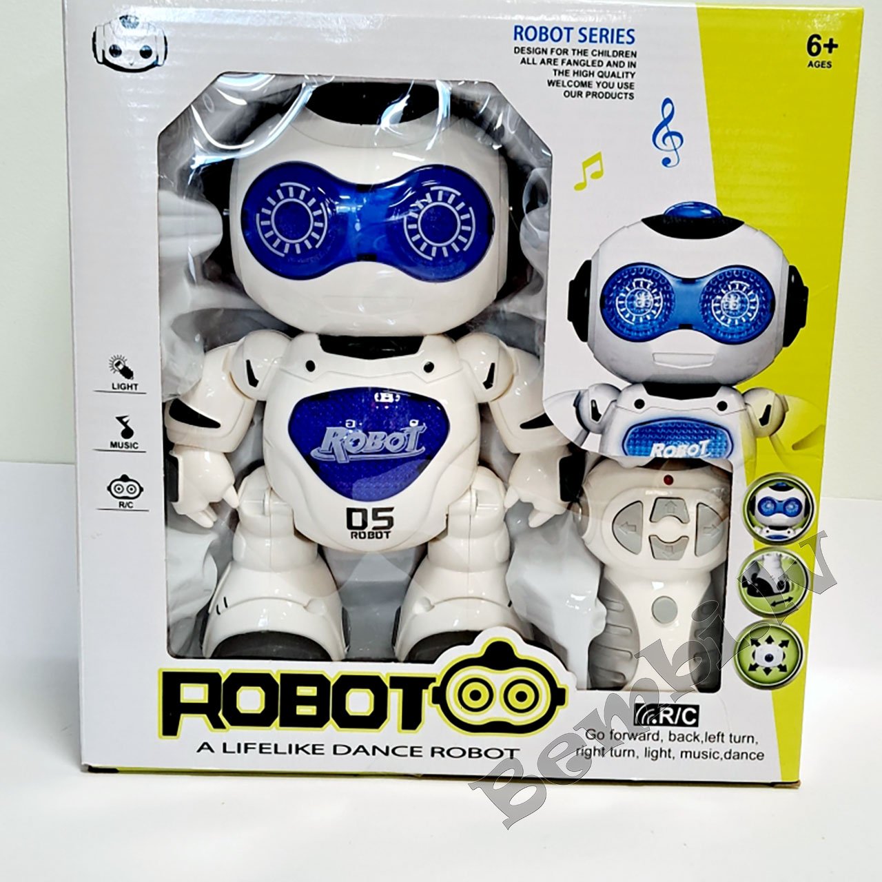 Robots staigā, griežas, tam ir skaņas un gaismas efekti.