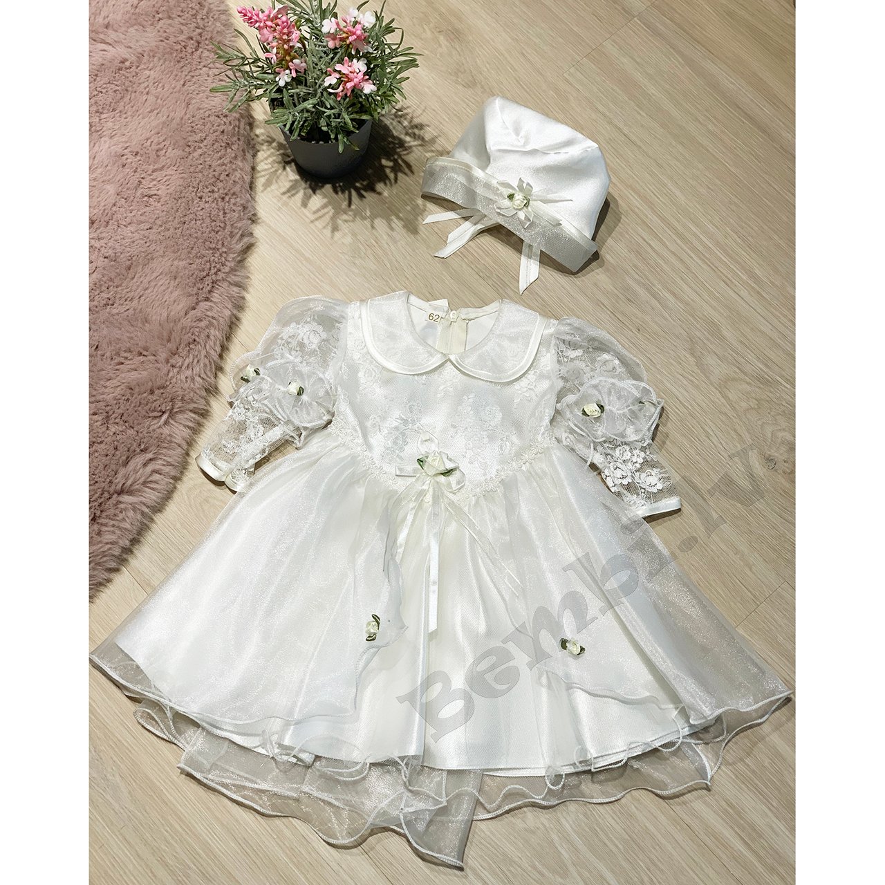 Šampanieša krāsas svētku kleita ar izšūtām puķēm, tilla volāniem, mežģīņraksta piedurknes.