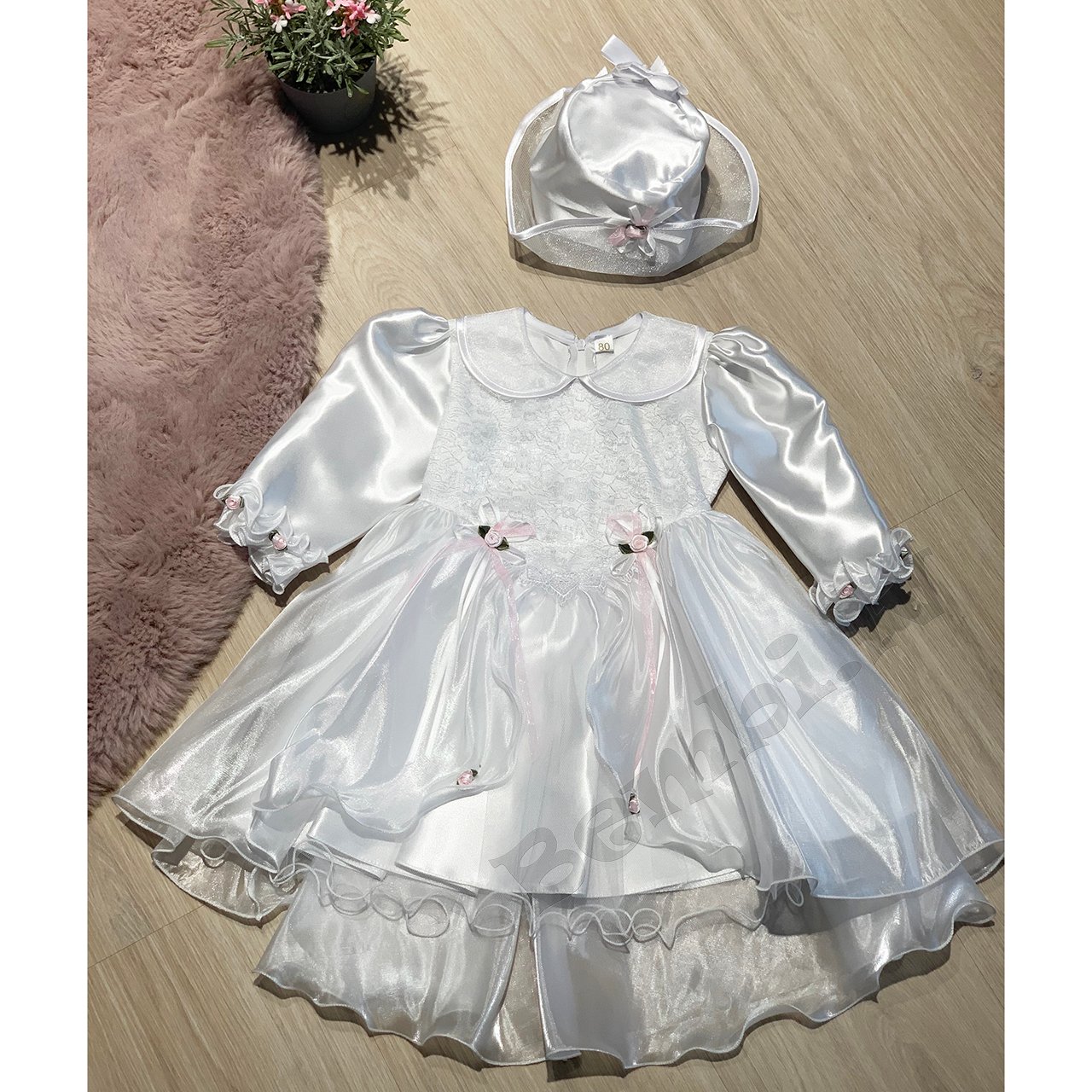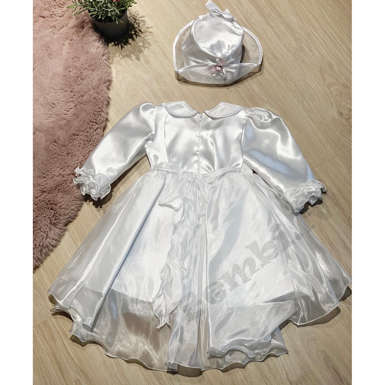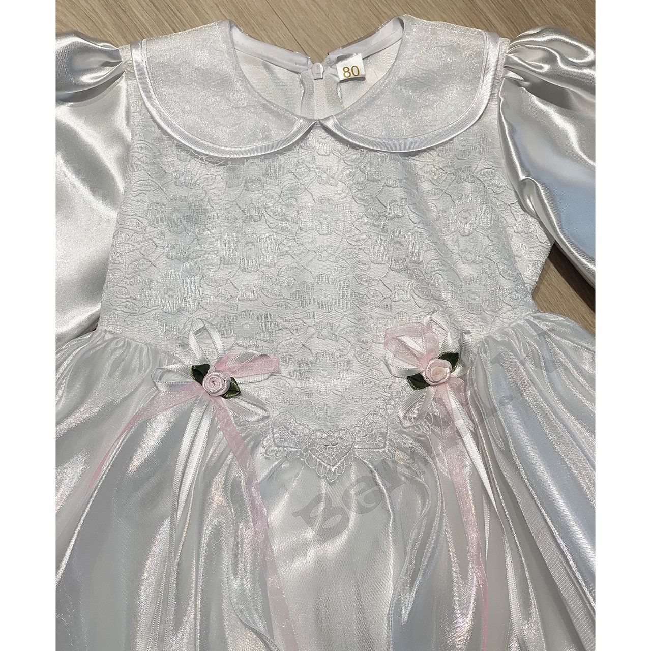 Balta svētku kleita ar mežģīņu slāni priekšpusē, tilla volāniem.
