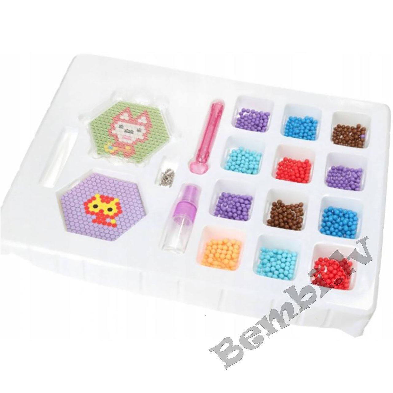 Uzgludināmu pērlīšu komplekts. Dažādu krāsu pērlītes interesantu attēlu veidošanai. Komplektā ietilpst šabloni, neliels ūdens trauks un pincete. Instrukcija: Uzklājiet rakstu, vienmērīgi apsmidziniet ūdeni, pagaidiet apmēram 20 minūtes, un gatavais produkts ir savienotu pērlīšu komplekts. Rotaļājoties, bērni attīsta fiziskās prasmes, novērošanas un apstrādes prasmes. Iepakojuma izmēri: 37,5 x 27,5 x 4 cm. Vecums: no 3 gadiem.